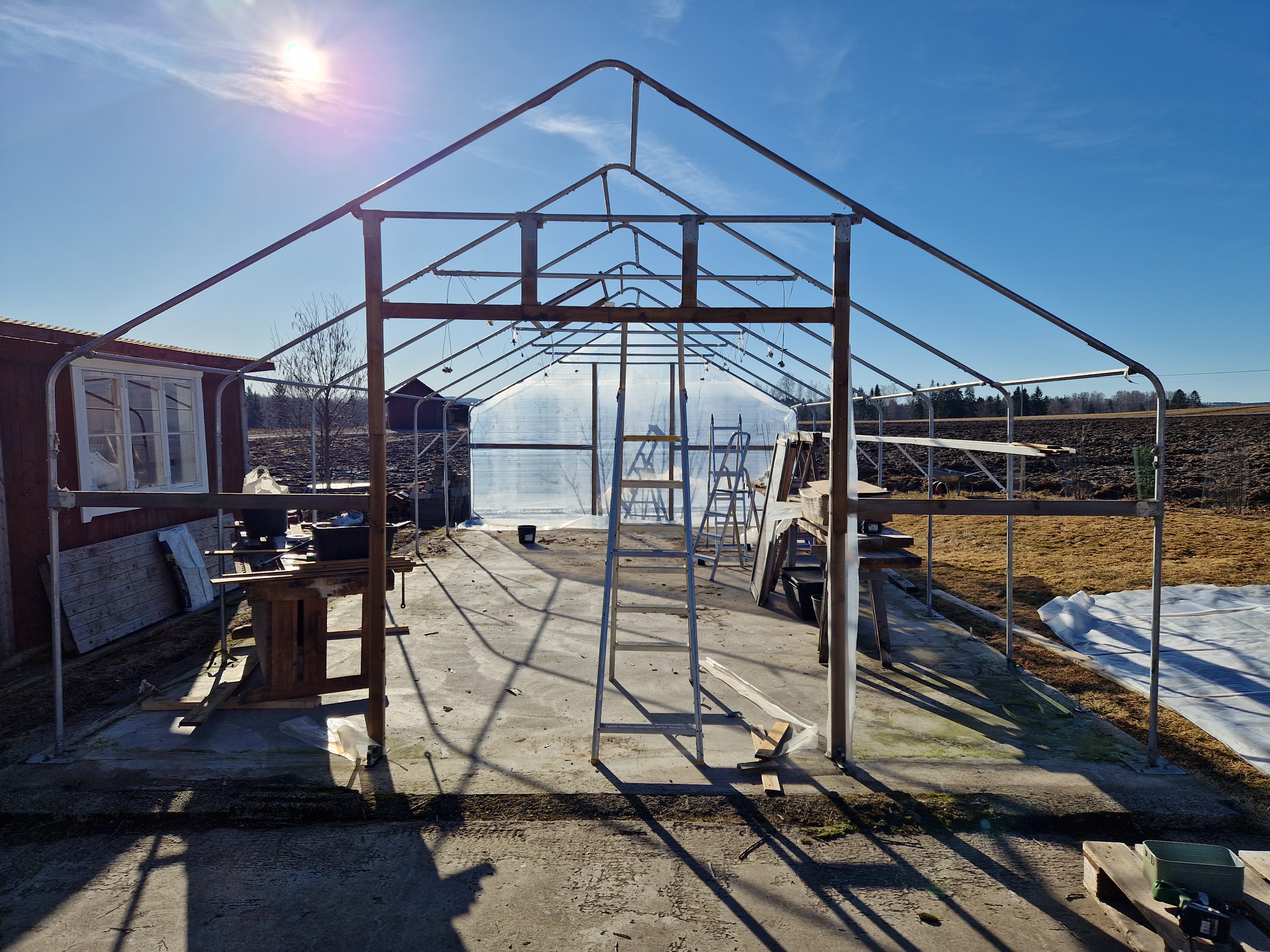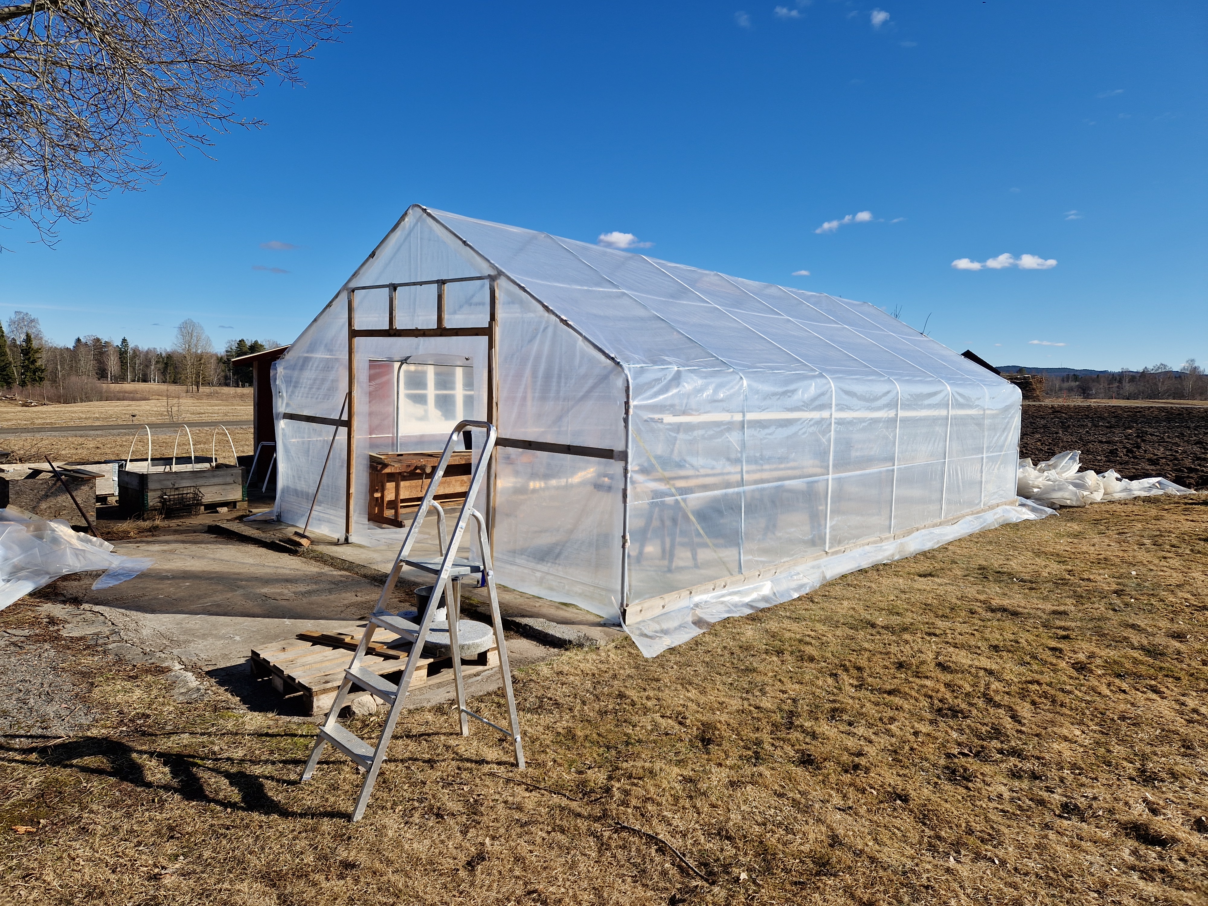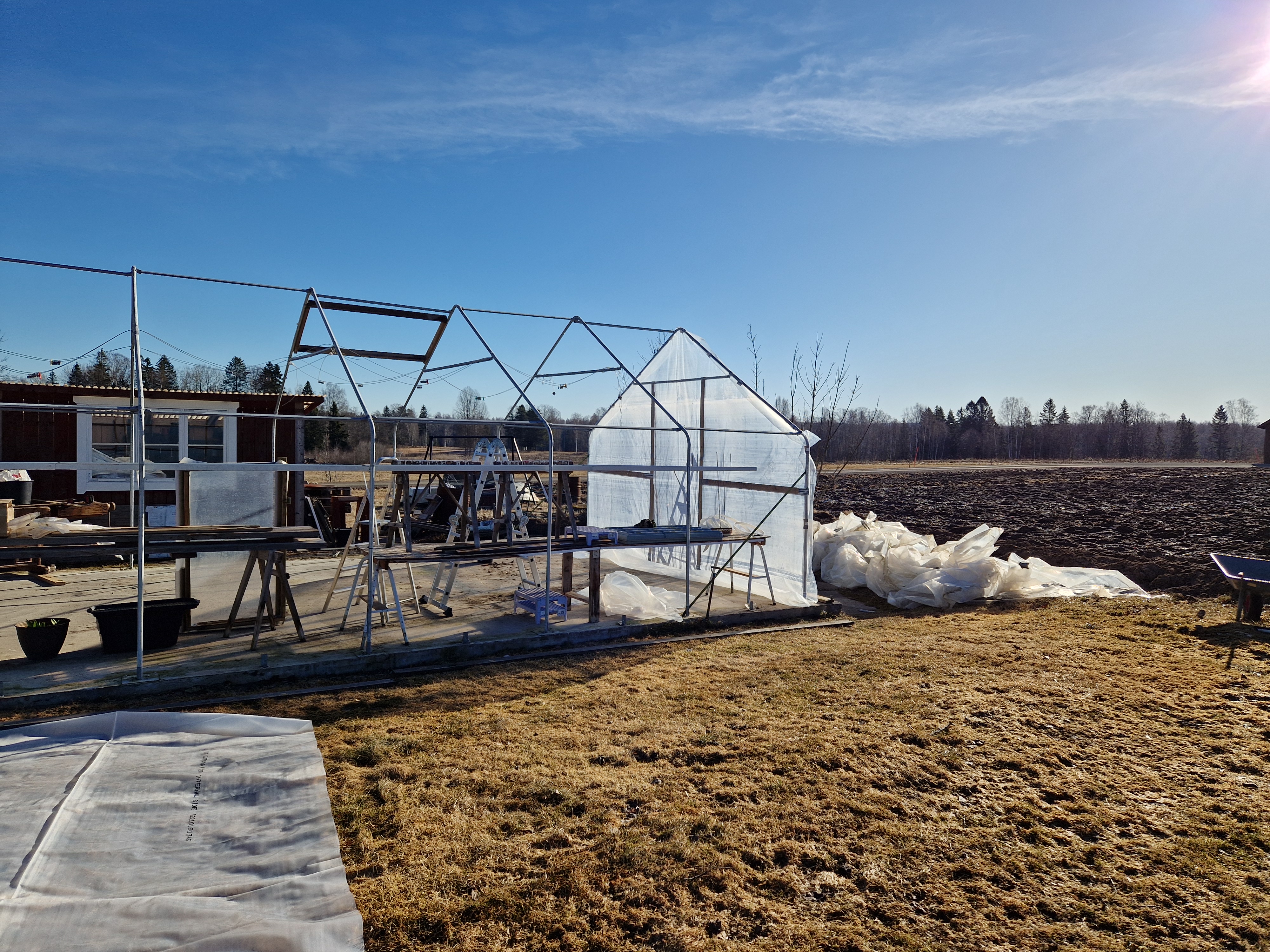 Massor har gjorts och förberetts inför att plantor snart ska flytta in i växthuset. Byte av plast på det stora växthuset har varit det största jobbet, sen ska allting tillbaka (bord och bänkar som lyfts ut under arbetet), presenning och gardiner hängas upp igen.