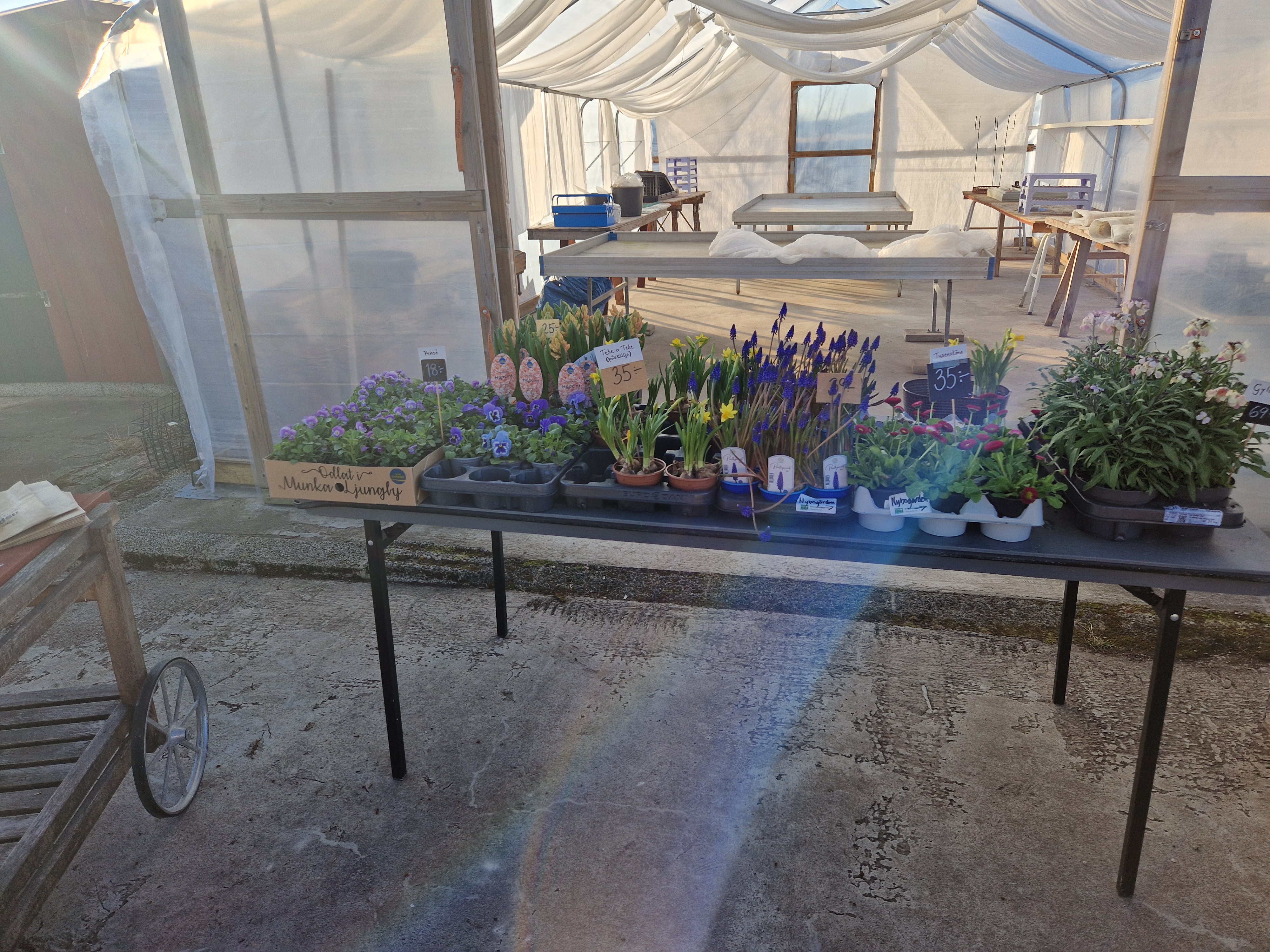 Utanför växthuset säljer jag lite vårblommor som påsklilja, hyacint, pärlhyacint, pensè, gyllenlack och tusensköna.